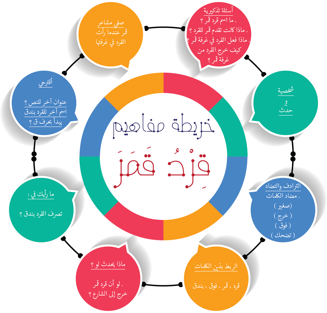 قَمَرُ لَهَا قِرْدٌ صَغِيرٌ اسْمُهُ بُنْدُقٌ، وَضَعَتْهُ فِي قَفَصٍ، وَقَدَّمَتْ لَهُ الطَّعَامَ وَالشَّرَابَ. وَفِي يَوْمٍ مِنَ الْأَيَّامِ خّرِجِ بُنْدُقٌ مِنَ الْقَفَصِ وَدَخَلَ غُرْفَةَ قَمَرَ، وَأَخَذَ يَقْفِزُ فَوْقَ السَّرِيرِ، ثُمَّ لَبِسَ قَمِيصًا وَقِلادَةً وَوَضَعَ فِي أُذُنِهِ قُرْطًا، وَقَمَرُ تُرَاقِبُهُ وَتَضْحَكُ. وَقَفَ بُنْدُقٌ أَمَامَ الْبَابِ ثُمَّ خَرَجَ مُسْرِعًا .