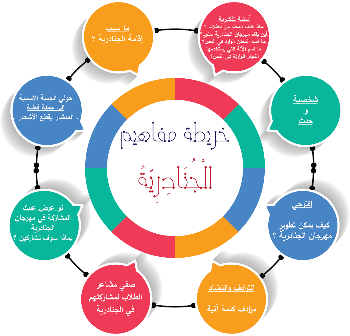 اقْتَرَبَ مَوْعِدُ الْجُنَادِرِيَّةِ فَقَالَ الْمُعَلِّمُ : لَابُدَّ مِنَ الْمُشَارَكَةِ، قَالَ شَادِي: لَدَيَّ لَوْحَةٌ مِنَ النُّحَاسِ الْمَنْقُوشِ، وَقَالَ أَمْجَدُ: وَأَنَا لَدَيَّ آنِيَةٌ مِنَ الزُّجَاجِ الْمُزَخْرَفِ، وَقَالَ شَرِيفٌ: وَأَنَا وَالِدِي نَجَّارٌ آلَتُهُ الْمِنْشَارُ يَقْطَعُ الْأَشْجَارَ وَيصْنَعُ الْمَوَائِدَ وَالْكَرَاسِيَّ. سَنُشَارِكُ جَمِيعًا فَنَحْنُ بُنَاةُ الْوَطَنِ .